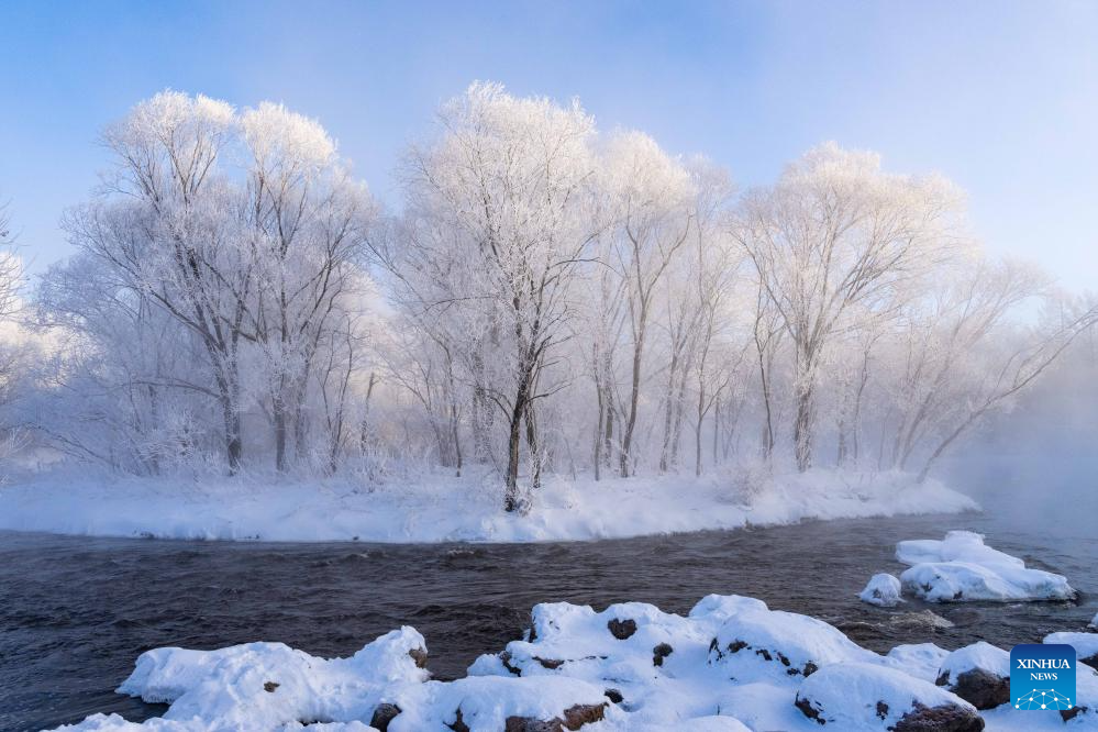 This photo taken on Feb. 2, 2024 shows the rime scenery along the Kurbin River near Pingtai Village in Xunke County of Heihe, northeast China's Heilongjiang Province. (Xinhua/Xie Jianfei)