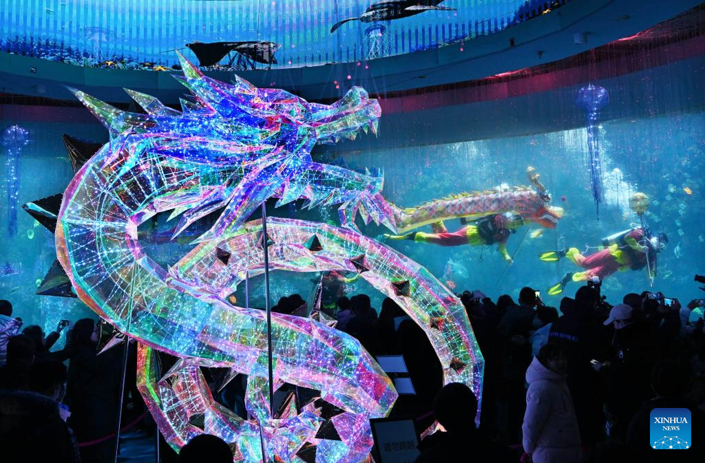 Tourists watch underwater dragon dance performance at Qingdao Polar Ocean Park in Qingdao, east China's Shandong Province, Feb. 3, 2024. The underwater dragon dance was staged to celebrate the upcoming Chinese Lunar New Year of the Dragon. (Xinhua/Li Ziheng)