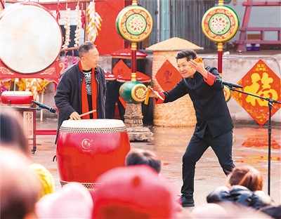 Photo shows Zhang Yong (left), a drum and gong performer, and Zhang Yunjian (right), an allegro artist, during a performance. (Photo courtesy of the organizer of the village gala)