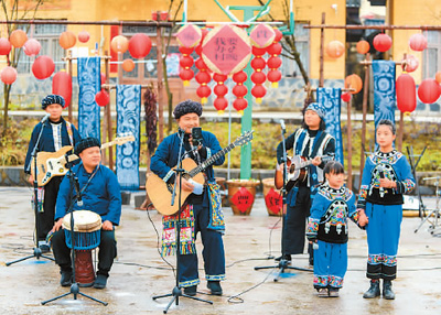 Members of a Miao ethnic band perform a song with children. (Photo courtesy of the organizer of the village gala)