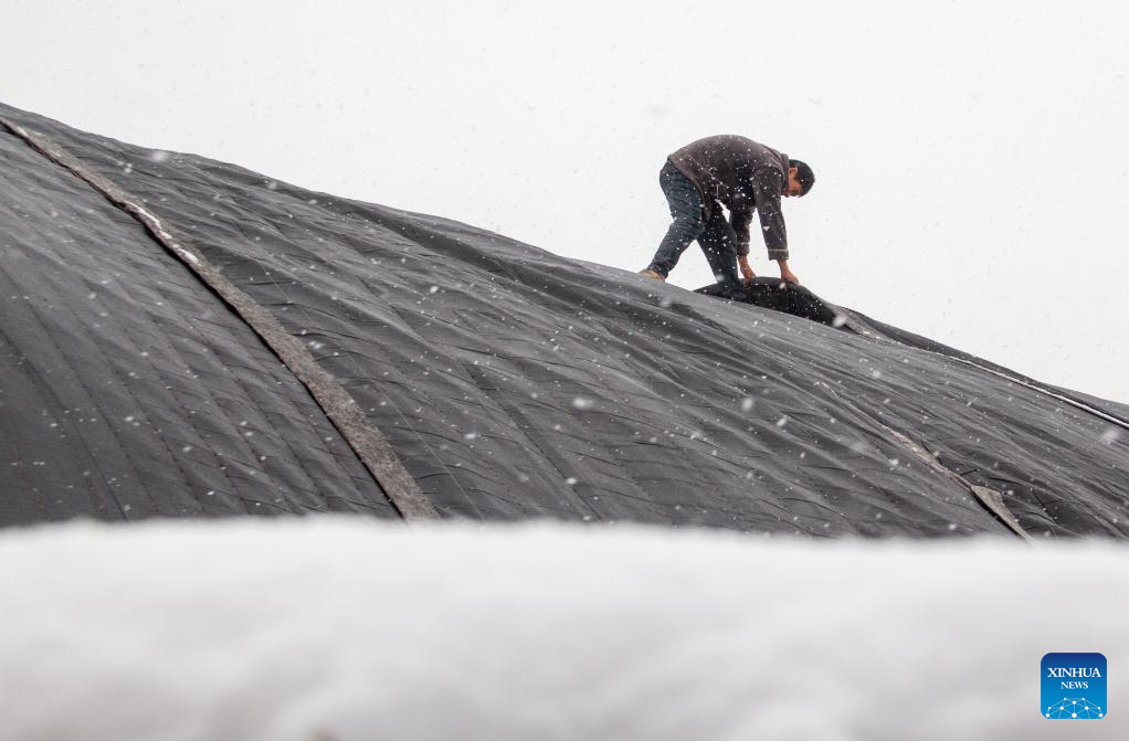 A villager reinforces a greenhouse amid snowfall in Zhuwafang Village of Xiayi County, central China's Henan Province, Feb. 4, 2024. Heavy snowfall has hit some areas of central and eastern China since Wednesday, leading to transport disruption amid the ongoing Spring Festival travel rush. (Photo by Wang Gaochao/Xinhua)