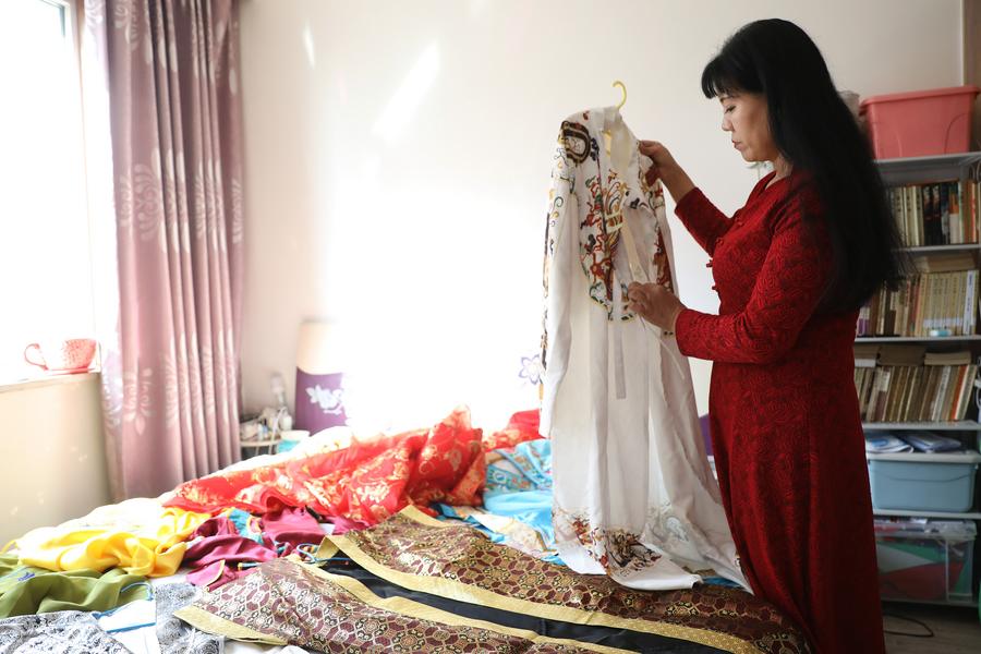 Wang Yanjuan arranges costumes used for "Dongbei Dagu" performance at home in Yingkou, northeast China's Liaoning Province, Feb. 1, 2024. (Xinhua/Yao Jianfeng)