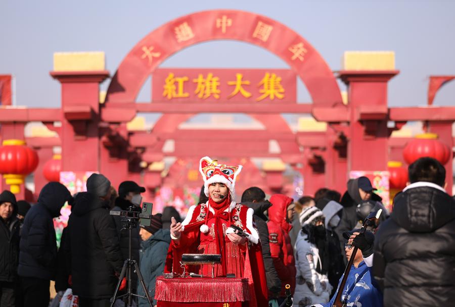 Wang Yanjuan stages a "Dongbei Dagu" show at a folk custom fair in Yingkou, northeast China's Liaoning Province, Feb. 2, 2024. (Xinhua/Yao Jianfeng)