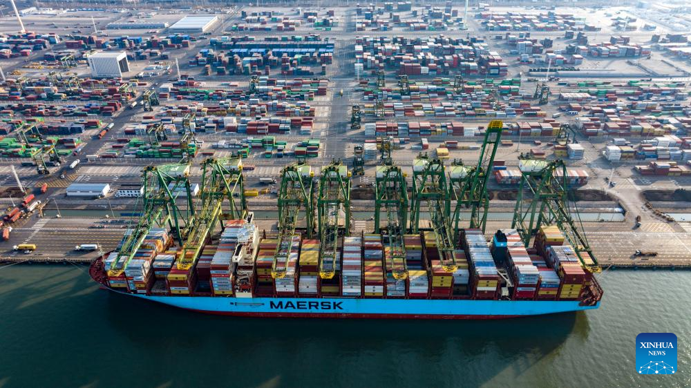 An aerial drone photo taken on Feb. 2, 2024 shows an international container terminal of Tianjin Port in north China's Tianjin. Tianjin Port, located on the coast of the Bohai Sea, is a major shipping point in north China. (Xinhua/Zhao Zishuo)