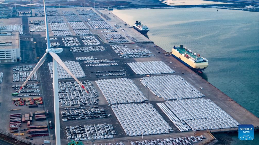 An aerial drone photo taken on Feb. 3, 2024 shows vehicles at a ro-ro dock of Tianjin Port in north China's Tianjin. Tianjin Port, located on the coast of the Bohai Sea, is a major shipping point in north China. (Xinhua/Zhao Zishuo)