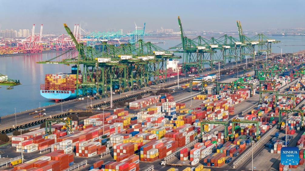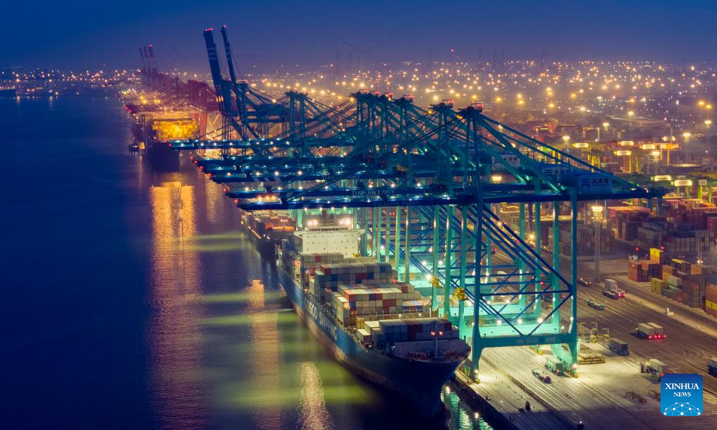 An aerial drone photo taken on Feb. 3, 2024 shows a container terminal of Tianjin Port in north China's Tianjin. Tianjin Port, located on the coast of the Bohai Sea, is a major shipping point in north China. (Xinhua/Zhao Zishuo)