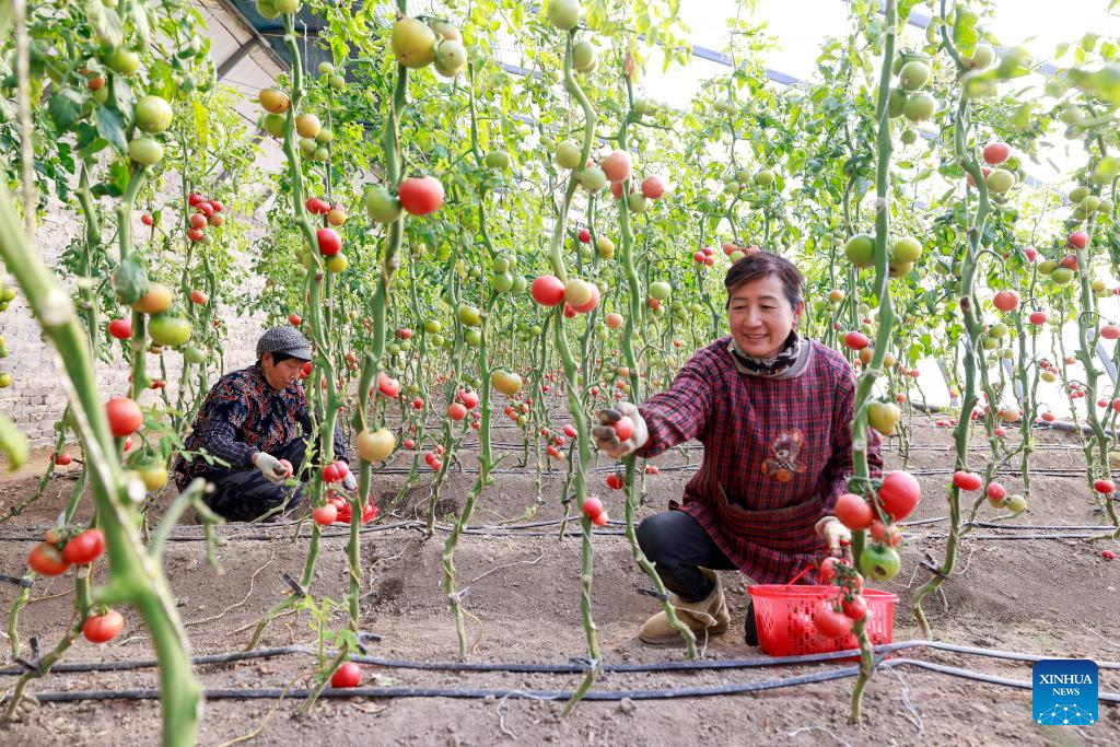 Villagers pick tomatoes in a field in Chahe Town of Tangshan, north China's Hebei Province, Feb. 4, 2024. Sunday marks "Lichun", meaning the beginning of spring, the first solar term in the traditional Chinese lunar calendar. (Photo by Li Xiuqing/Xinhua)