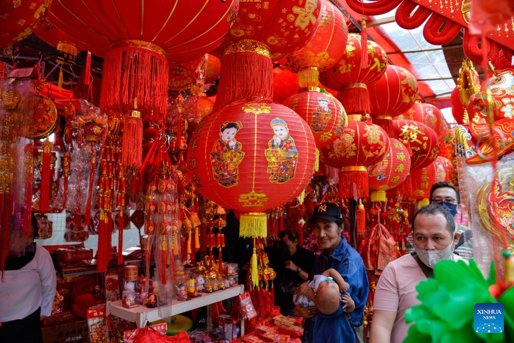 People walk past booths selling Spring Festival decorations at the Chinatown in Jakarta, Indonesia, Feb. 4, 2024. As the Chinese Lunar New Year, or the Spring Festival, approaches, the festive atmosphere gradually permeates the air of the Chinatown and many business districts in Jakarta. (Xinhua/Xu Qin)