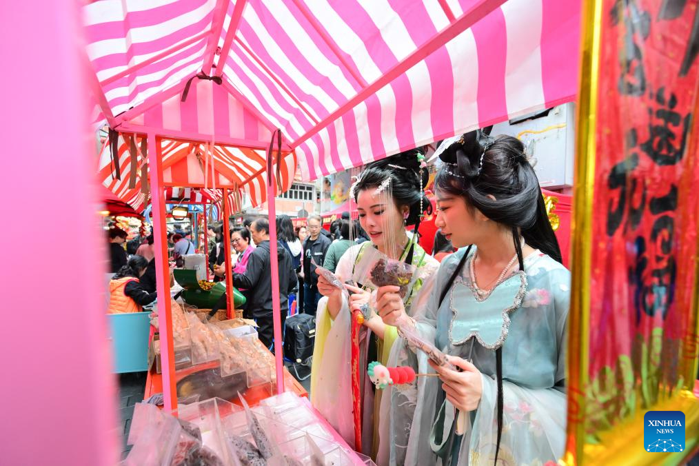 Visitors in Hanfu costumes, a style of clothing traditionally worn by the Han people, select snacks during an event celebrating the upcoming Chinese New Year at the Temple Street in south China's Hong Kong, Feb. 4, 2024. (Xinhua/Zhu Wei)