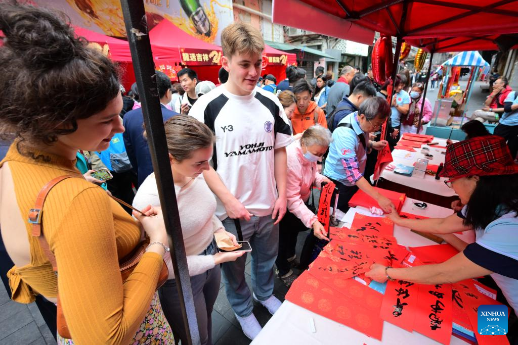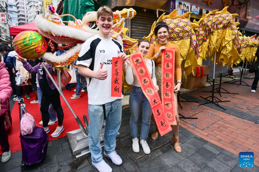 Overseas students pose for photos with Spring Festival couplets during an event celebrating the upcoming Chinese New Year at the Temple Street in south China's Hong Kong, Feb. 4, 2024. (Xinhua/Zhu Wei)