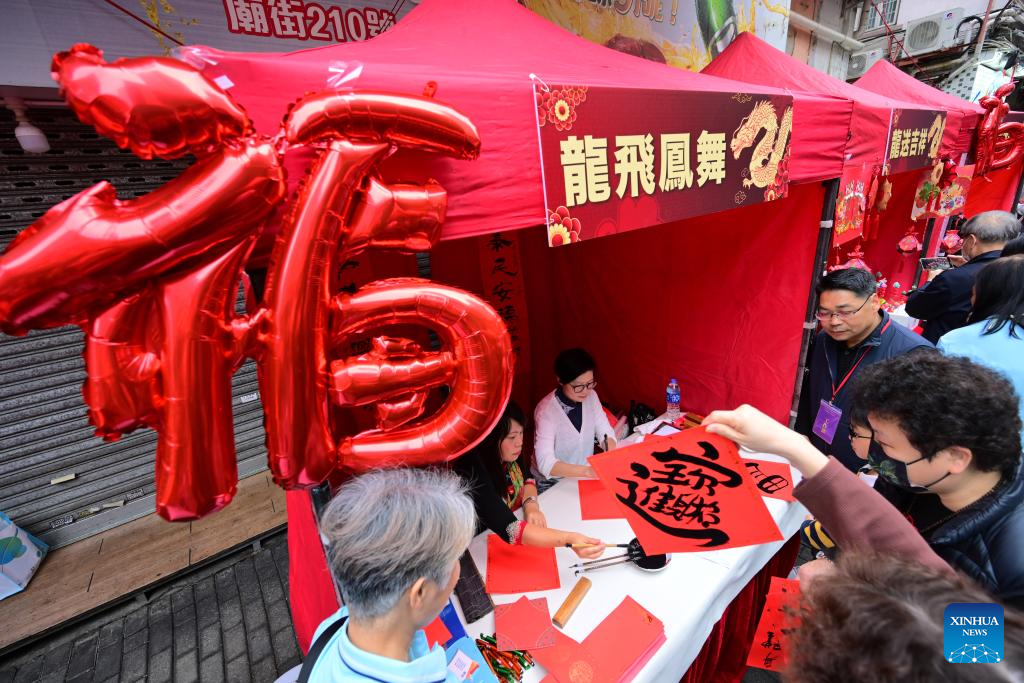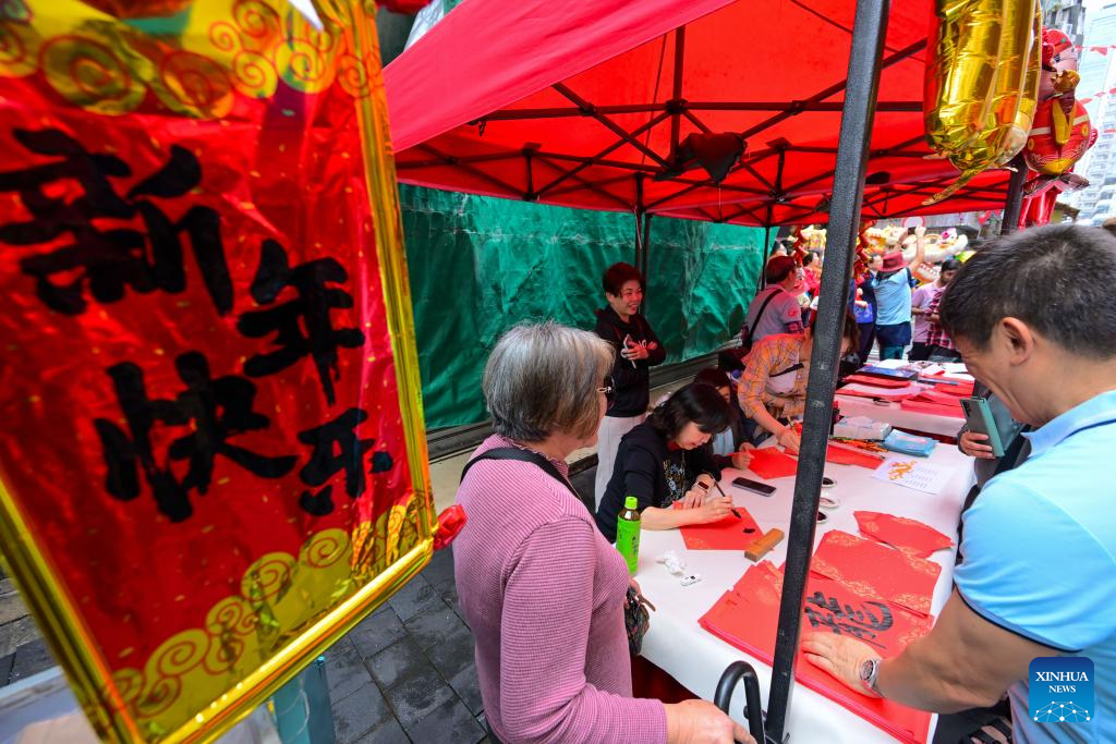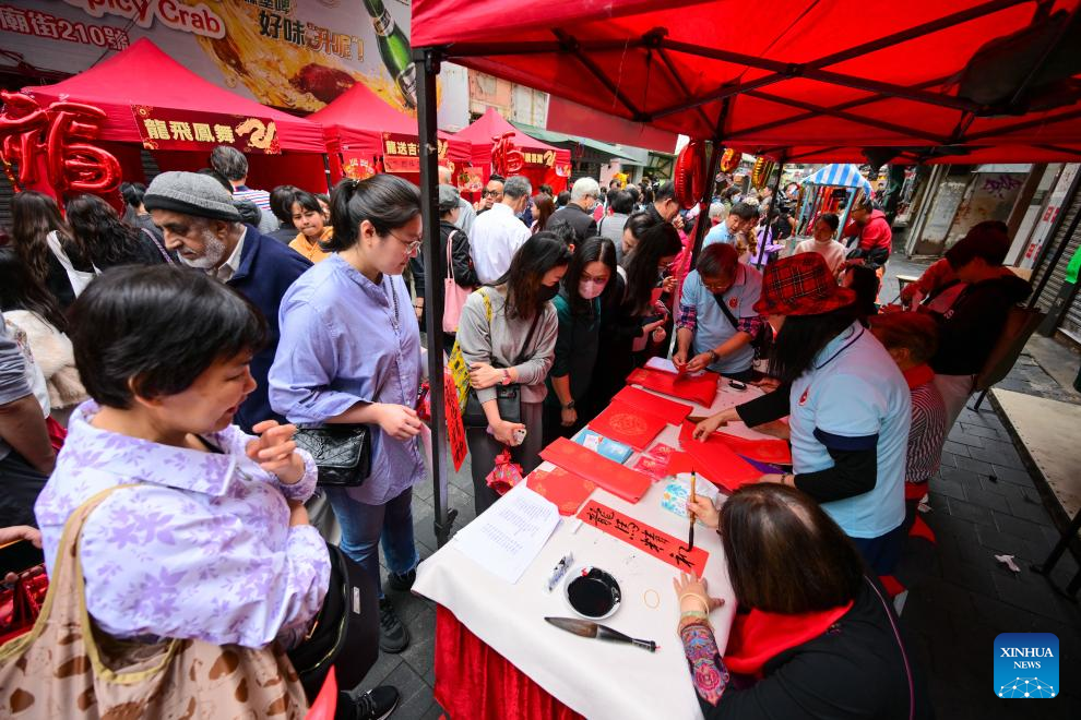 Artists write Spring Festival couplets during an event celebrating the upcoming Chinese New Year at the Temple Street in south China's Hong Kong, Feb. 4, 2024. (Xinhua/Zhu Wei)