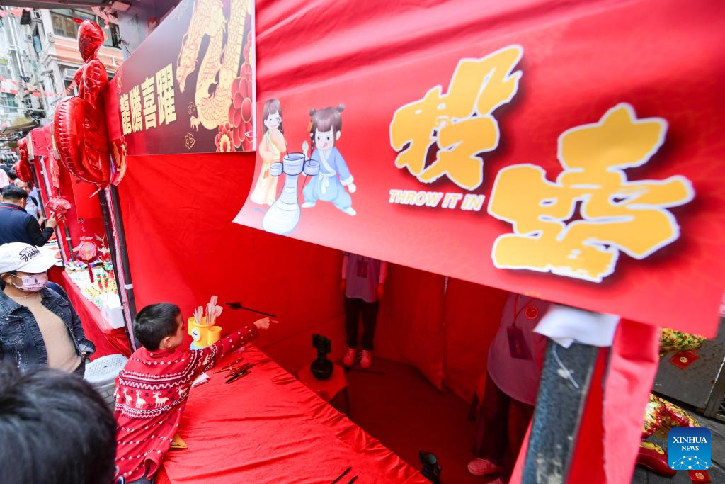 A boy plays Touhu game, or pitch-pot game, an ancient entertainment that requires players to throw arrows from a set distance into a pot, during an event celebrating the upcoming Chinese New Year at the Temple Street in south China's Hong Kong, Feb. 4, 2024. (Xinhua/Zhu Wei)