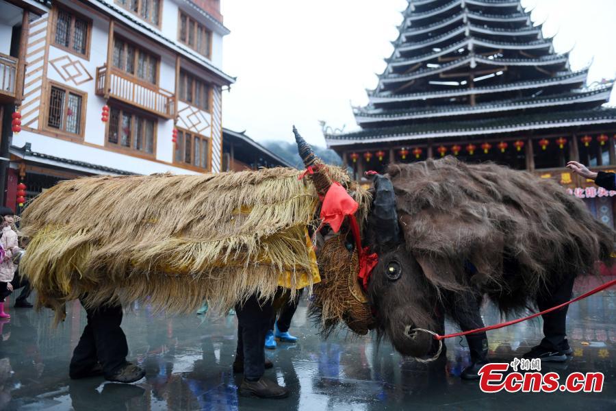 People take part in a straw cattle parade, a traditional cultural event to pray for a good harvest in the coming new year on Lichun, the beginning of spring, the first of the 24 solar terms in Chinese lunar calendar, in Guangnan Village of Guilin City, south China's Guangxi Zhuang Autonomous Region, Feb. 4, 2024. (Photo: China News Service/Pan Zhixiang)