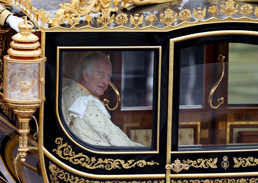 Britain's King Charles III departs Buckingham Palace for his coronation at Westminster Abbey in London, Britain, May 6, 2023. (Xinhua/Li Ying)
