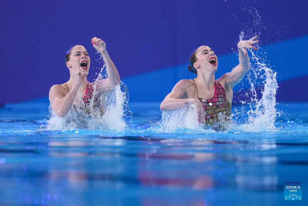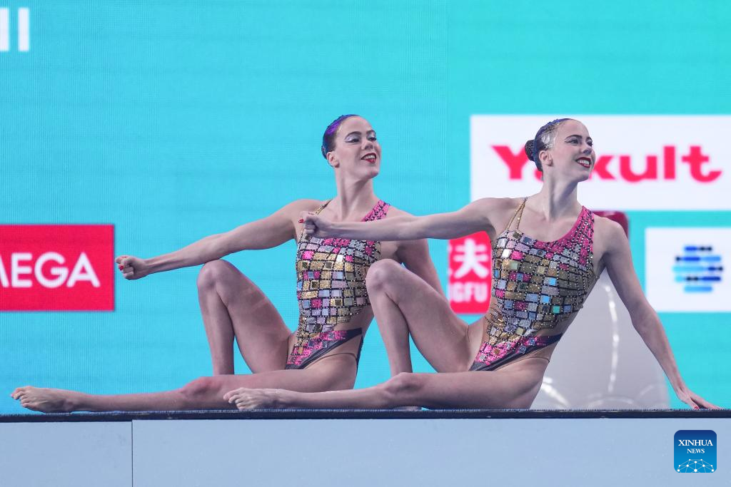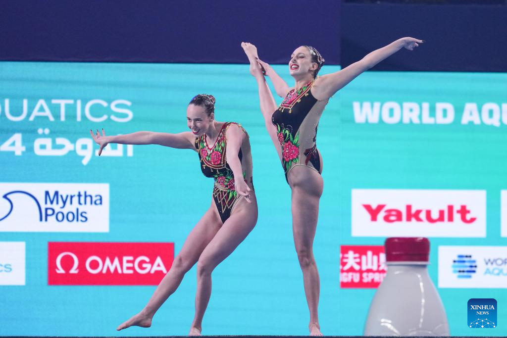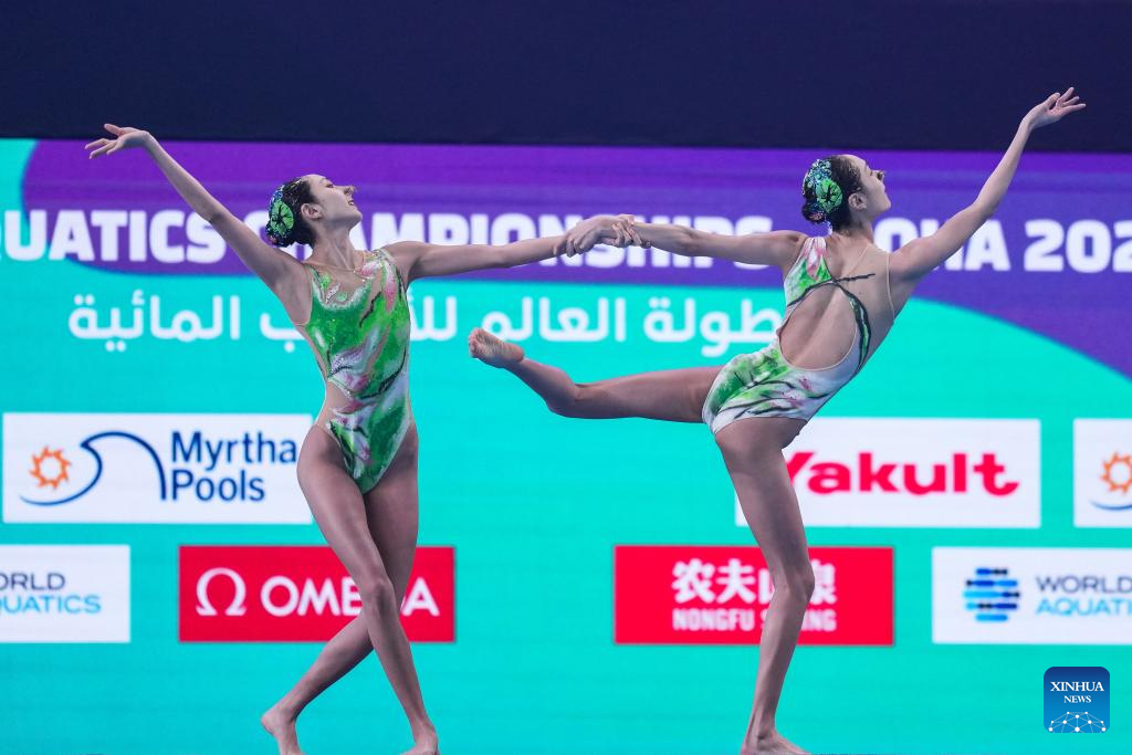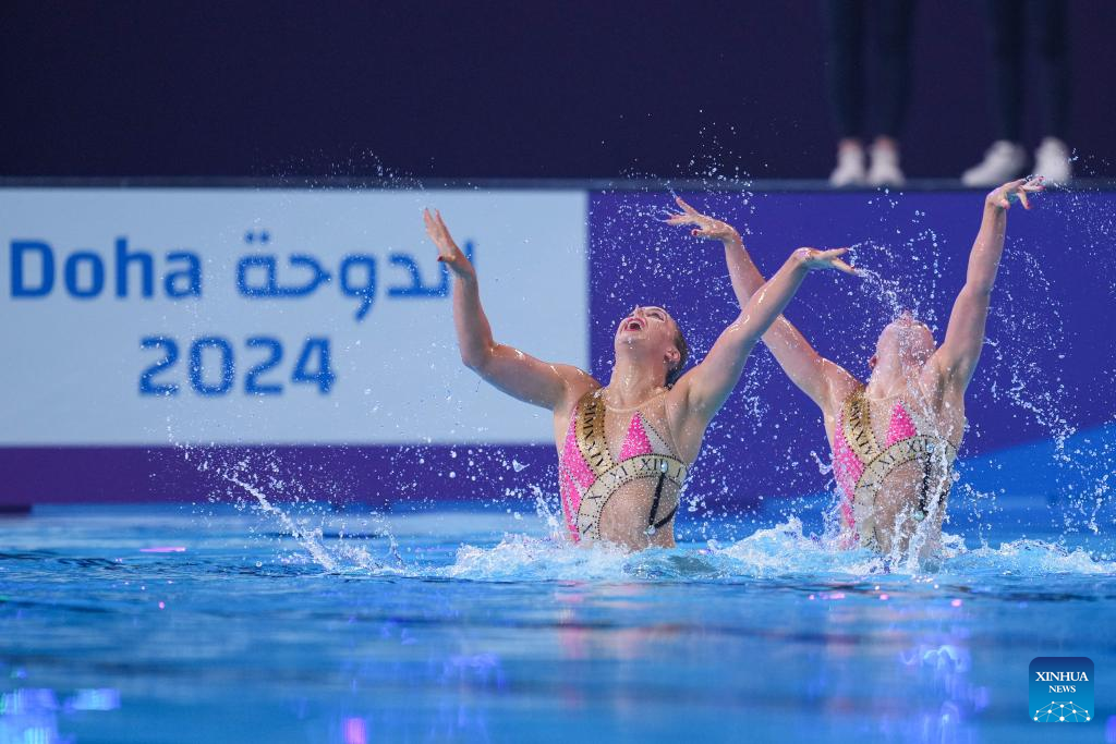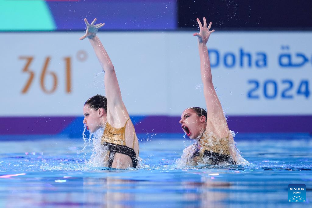 Alisa Ozhogina Ozhogin/Iris Tio Casas of Spain perform during the women's duet technical final of artistic swimming at the World Aquatics Championships 2024 in Doha, Qatar, Feb. 5, 2024. (Xinhua/Du Yu)