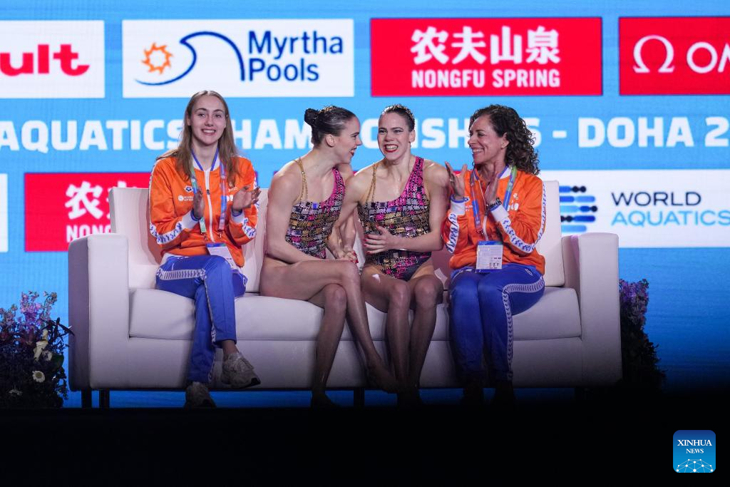 Bregje De Brouwer/Noortje De Brouwer of the Netherlands react after their performance during the women's duet technical final of artistic swimming at the World Aquatics Championships 2024 in Doha, Qatar, Feb. 5, 2024. (Xinhua/Du Yu)