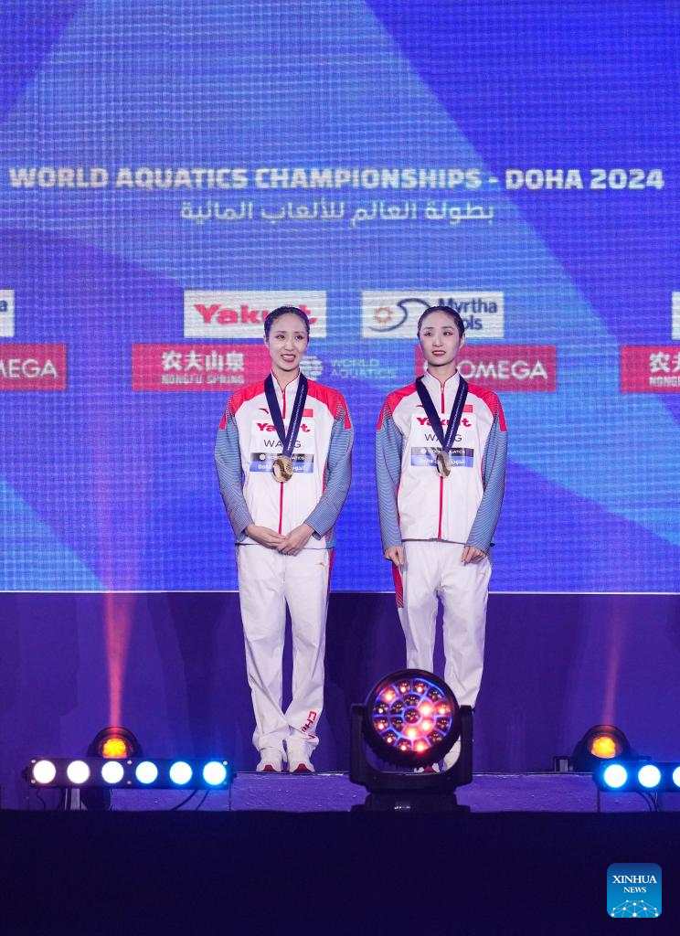 Gold medalists Wang Liuyi/Wang Qianyi of China react during the awarding ceremony of the women's duet technical final of artistic swimming at the World Aquatics Championships 2024 in Doha, Qatar, Feb. 5, 2024. (Xinhua/Du Yu)