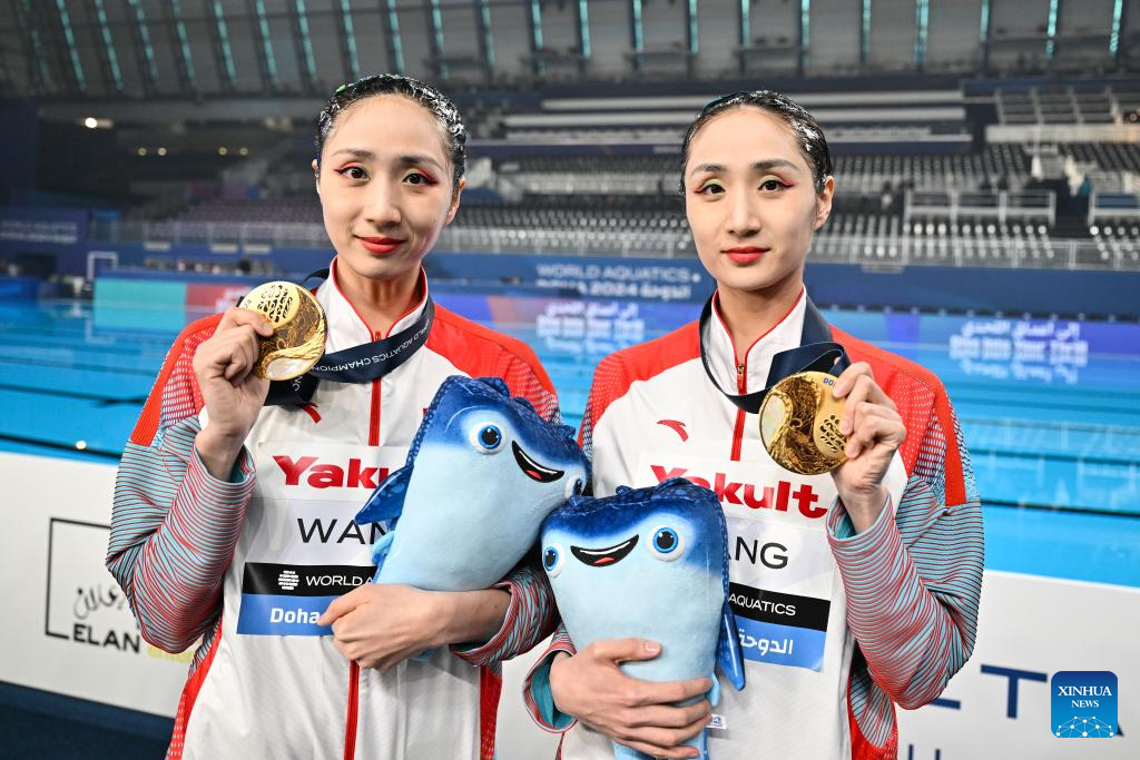 Wang Liuyi/Wang Qianyi of China pose with the gold medals after the awarding ceremony of the women's duet technical final of artistic swimming at the World Aquatics Championships 2024 in Doha, Qatar, Feb. 5, 2024. (Xinhua/Du Yu)