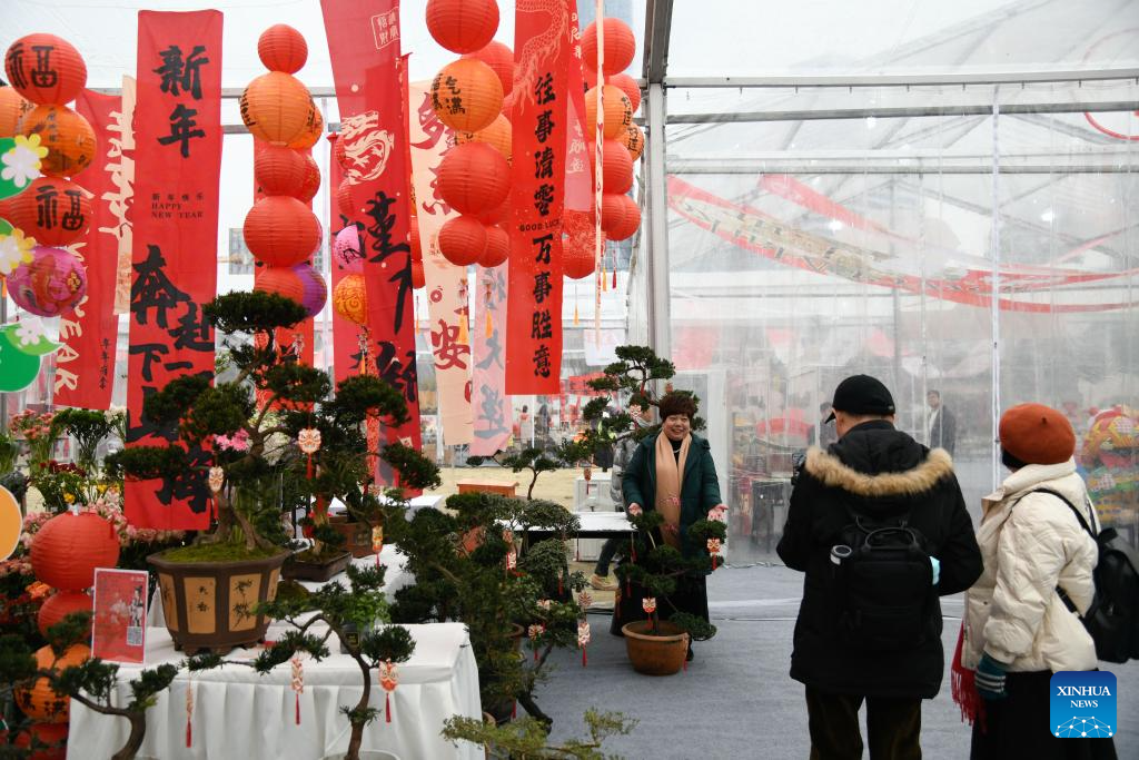 People buy a flower-shaped knit decoration at a flower fair at a park in Chengdu, southwest China's Sichuan Province, Feb. 5, 2024. Flower-themed fairs are being held in Chengdu to celebrate the upcoming Chinese New Year. (Xinhua/Xu Bingjie)