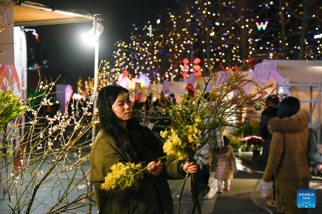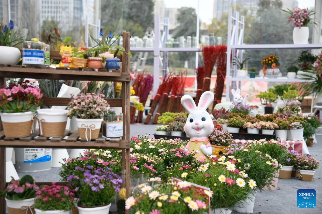 This photo taken on Feb. 4, 2024 shows a flower fair in a street in Chengdu, southwest China's Sichuan Province. Flower-themed fairs are being held in Chengdu to celebrate the upcoming Chinese New Year. (Xinhua/Xu Bingjie)