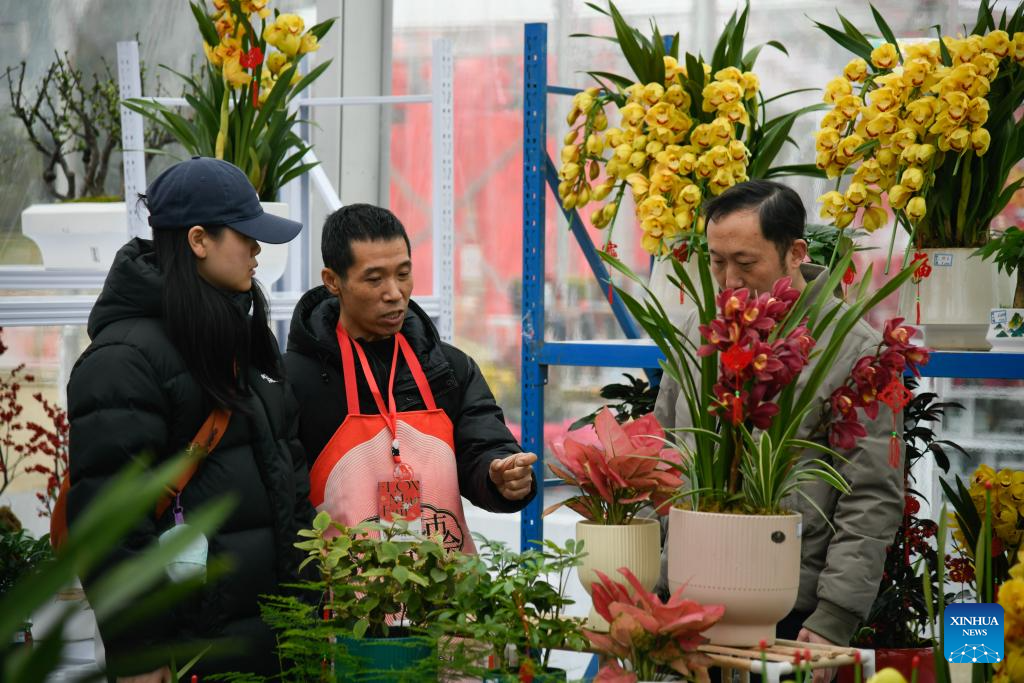 A visitor selects flowers at a flower fair at a park in Chengdu, southwest China's Sichuan Province, Feb. 5, 2024. Flower-themed fairs are being held in Chengdu to celebrate the upcoming Chinese New Year. (Xinhua/Xu Bingjie)