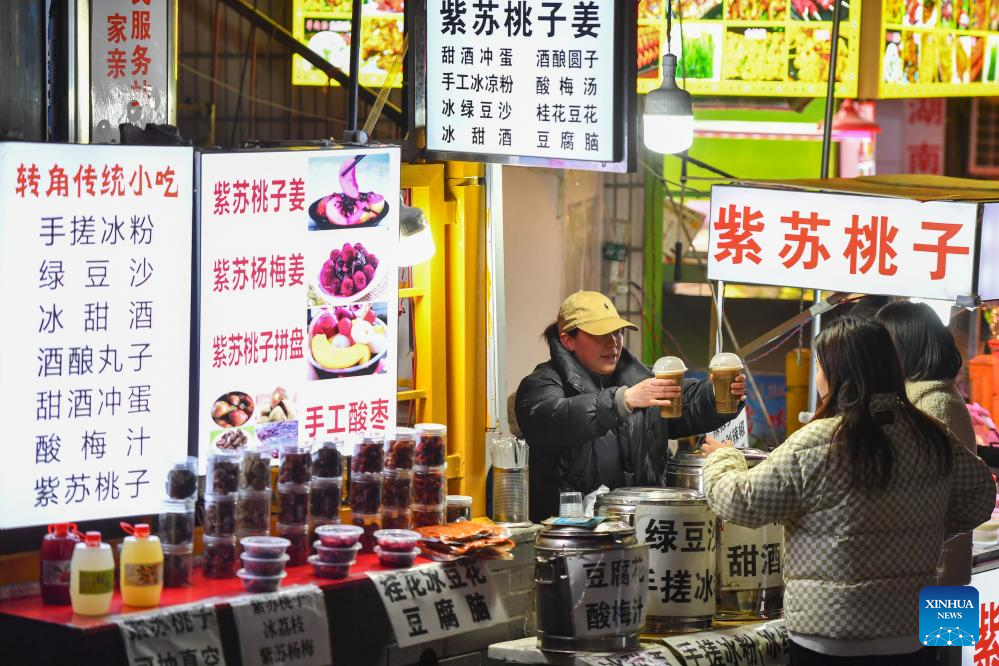 People buy snacks at a stall in a night market selling street food in Changsha, central China's Hunan Province, Feb. 4, 2024. To attract more visitors, stalls in this night market are making innovations such as developing new products and promoting via social media. (Xinhua/Chen Zeguo)