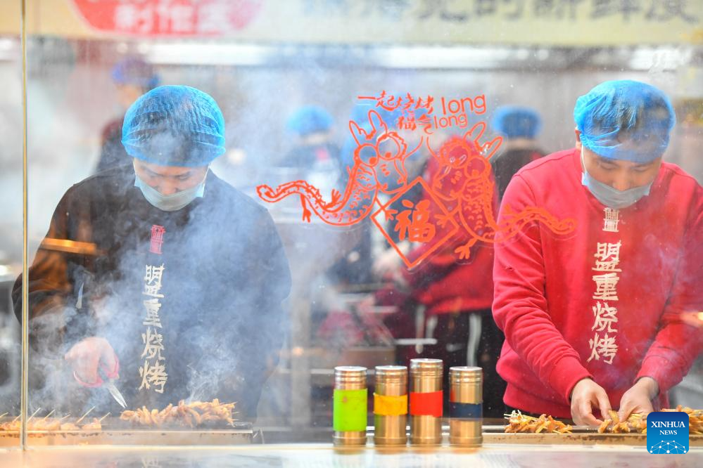 Staff members cook skewers at a stall in a night market selling street food in Changsha, central China's Hunan Province, Feb. 4, 2024. To attract more visitors, stalls in this night market are making innovations such as developing new products and promoting via social media. (Xinhua/Chen Zeguo)
