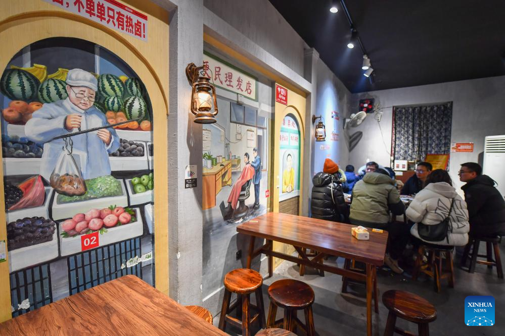 People dine at a stall in a night market selling street food in Changsha, central China's Hunan Province, Feb. 4, 2024. To attract more visitors, stalls in this night market are making innovations such as developing new products and promoting via social media. (Xinhua/Chen Zeguo)