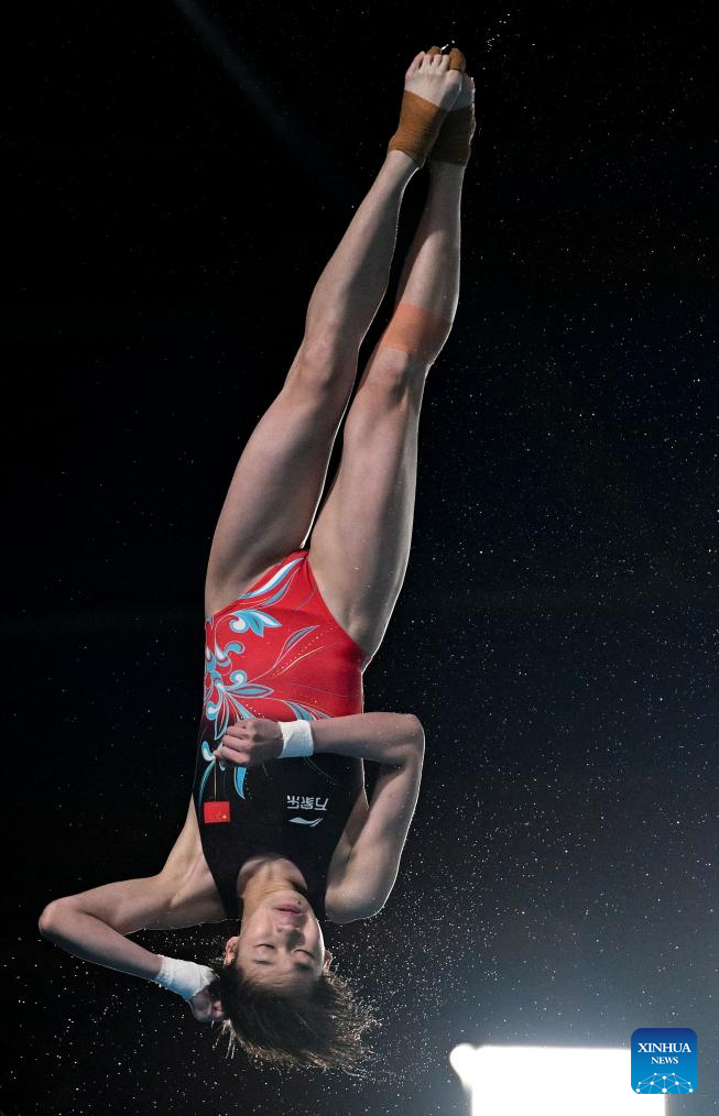 Quan Hongchan of China competes during the women's 10m platform final of diving at the World Aquatics Championships 2024 in Doha, Qatar, Feb. 5, 2024. (Xinhua/Luo Yuan)
