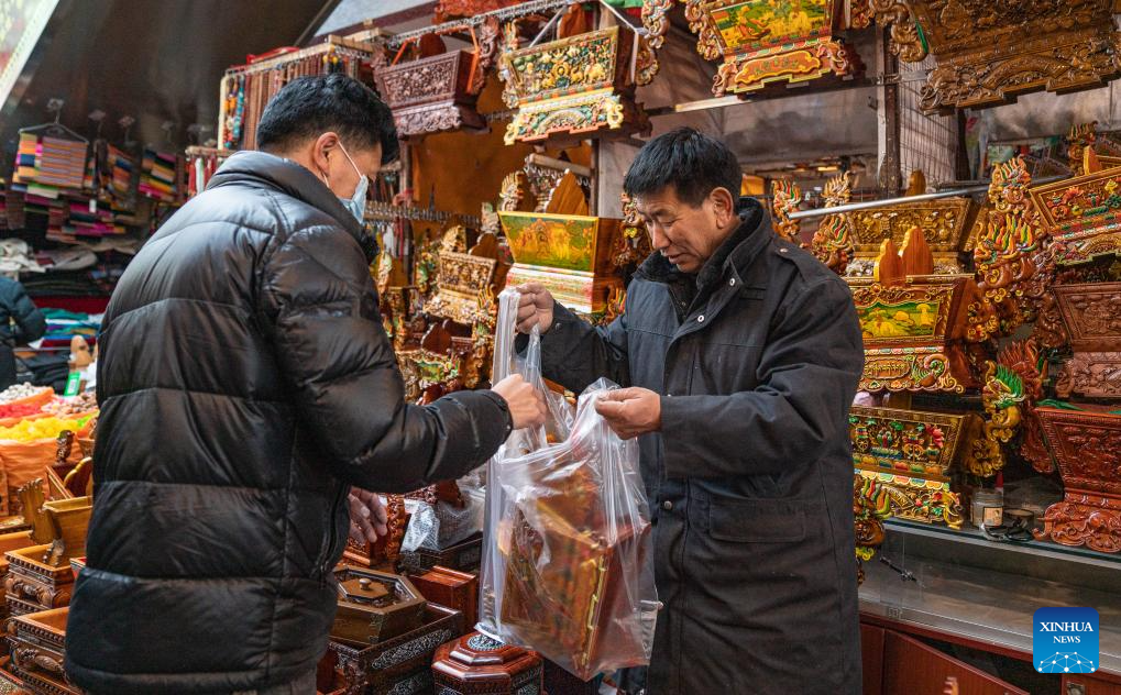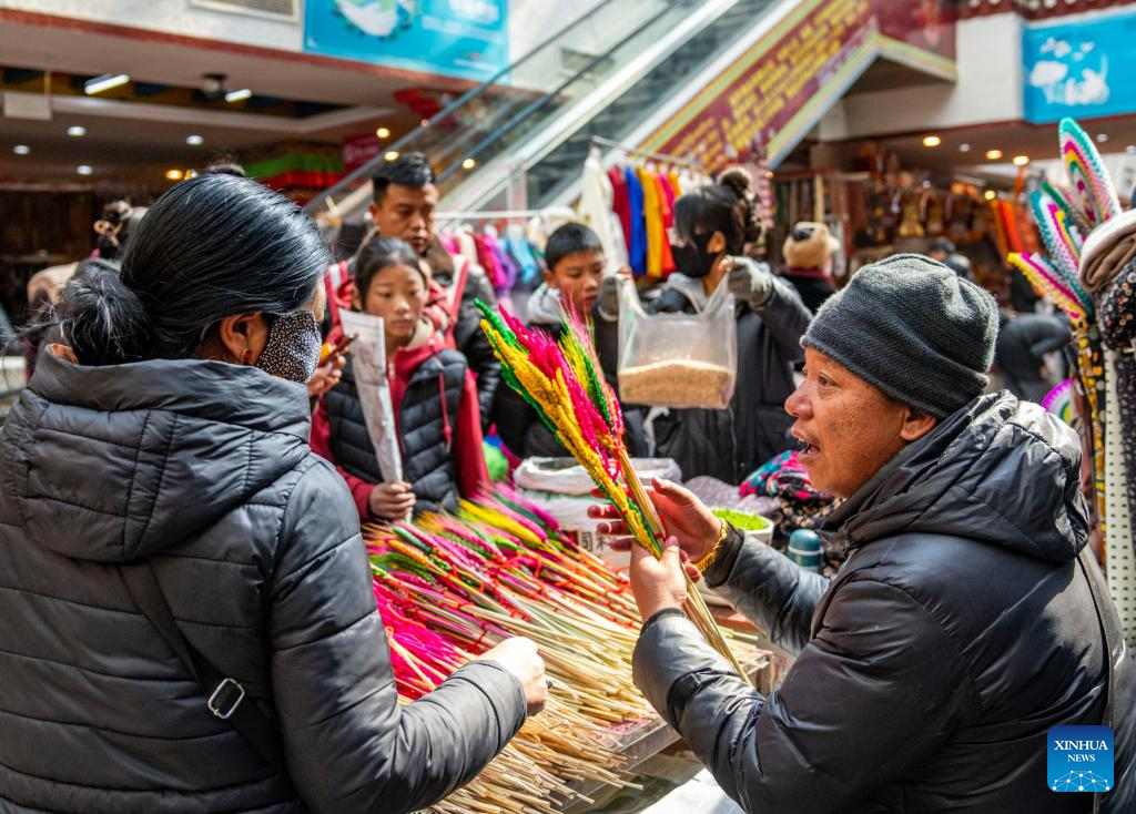 People visit and shop at a local market for the upcoming Chinese New Year in Lhasa, southwest China's Xizang Autonomous Region, Feb. 6, 2024. (Xinhua/Sun Ruibo)