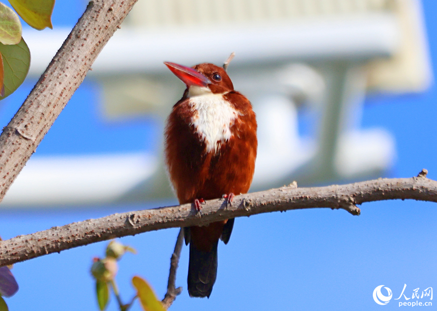 A white-throated kingfisher rests in a tree in Xiamen, southeast China's Fujian Province. (People's Daily Online/Chen Bo)