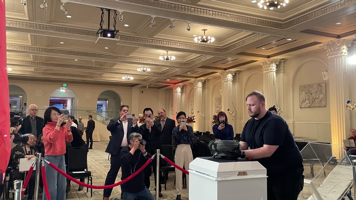 A staff member prepares for the display of the relic "Feng Xingshu Gui" at a repatriation ceremony at the Portland Art Museum in Oregon last month. LIA ZHU / CHINA DAILY