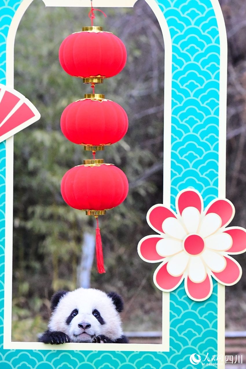 A giant panda cub is seen during an event to send Chinese New Year greetings in Chengdu, southwest China's Sichuan Province. (Photo/Li Chuanyou)