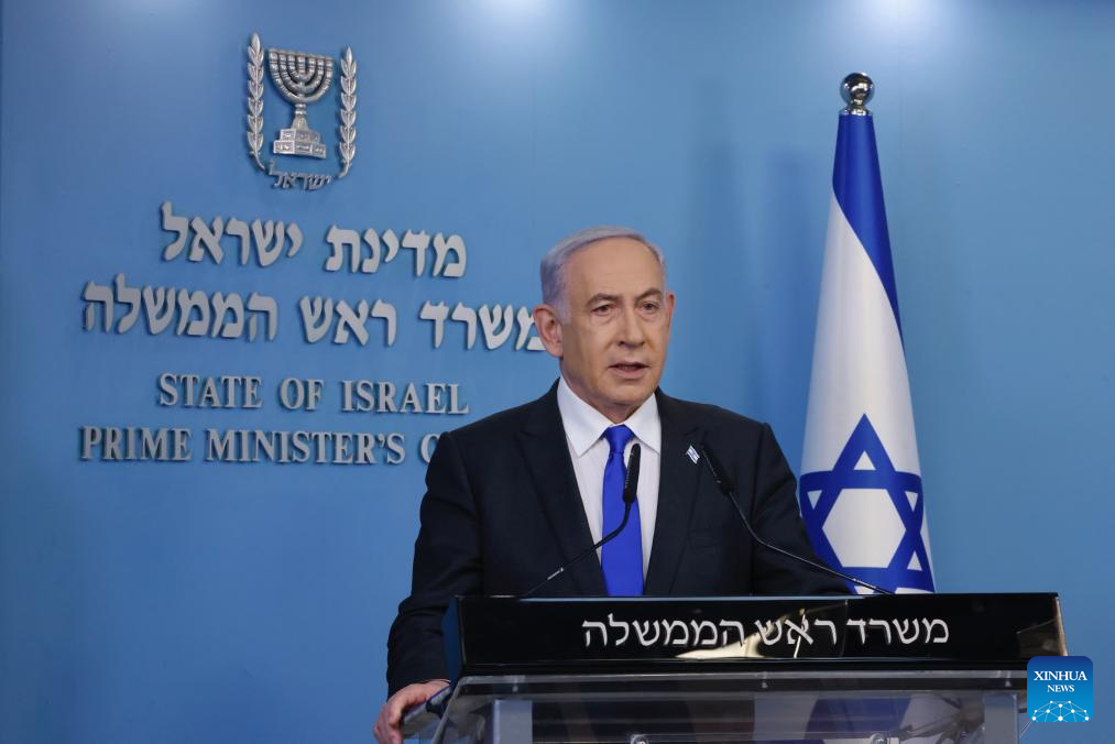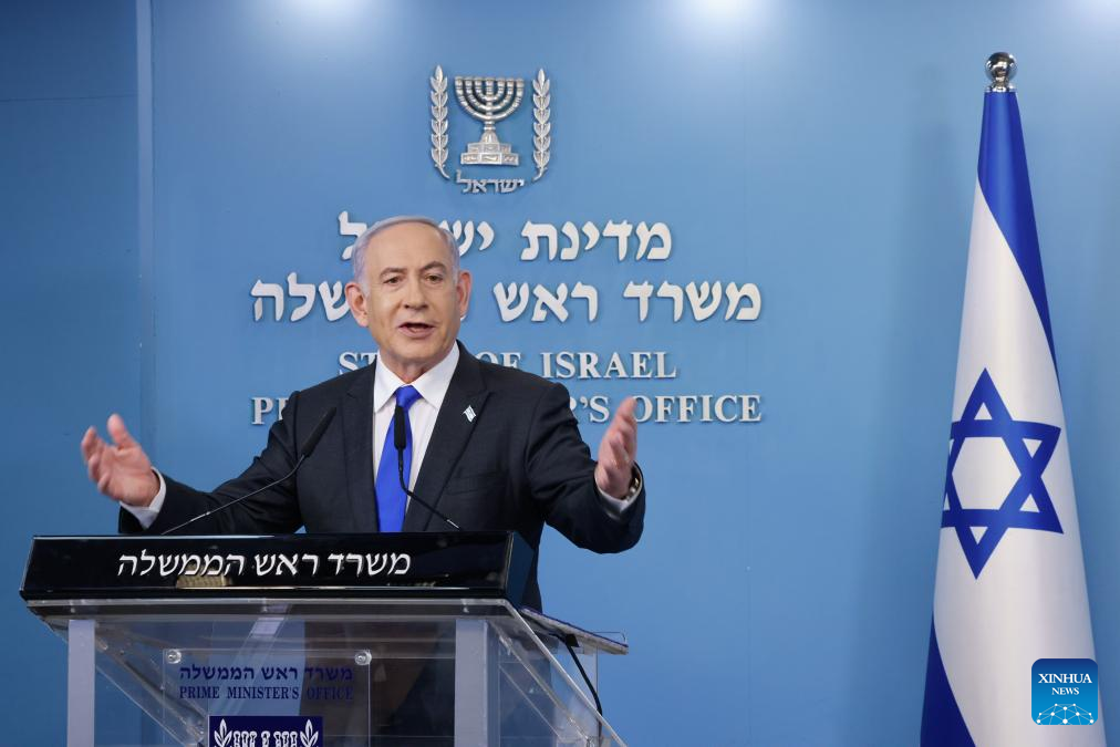 Israeli Prime Minister Benjamin Netanyahu speaks at a press conference at the Prime Minister's office in Jerusalem, on Feb. 7, 2024. Netanyahu rejected Hamas's proposal for a ceasefire in the Gaza Strip on Wednesday. (Marc Israel Sellem/JINI via Xinhua)