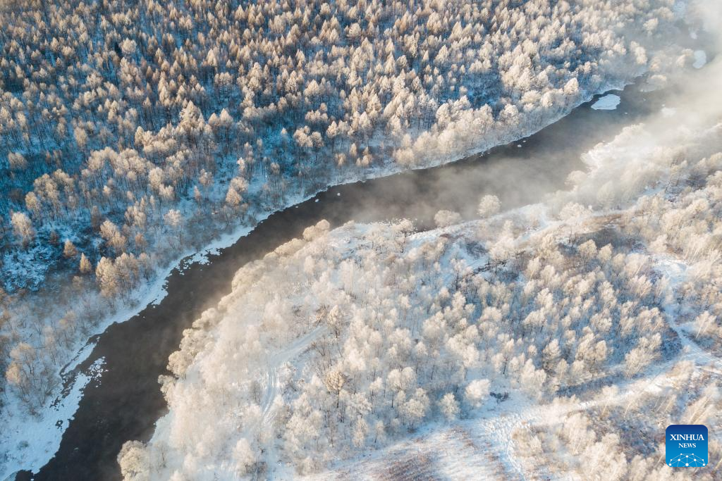 An aerial drone photo taken on Feb. 2, 2024 shows the rime scenery near Pingtai Village of Kelin Township, Xunke County, northeast China's Heilongjiang Province. (Xinhua/Xie Jianfei)