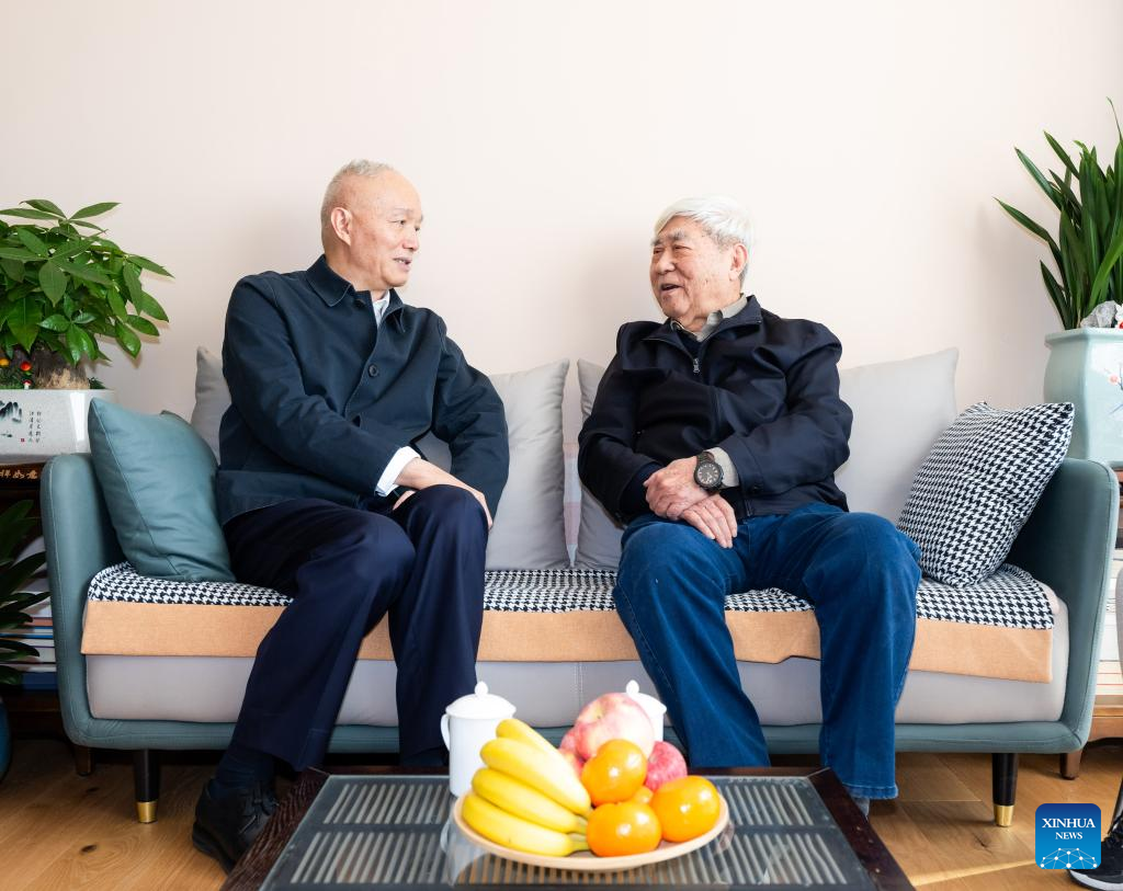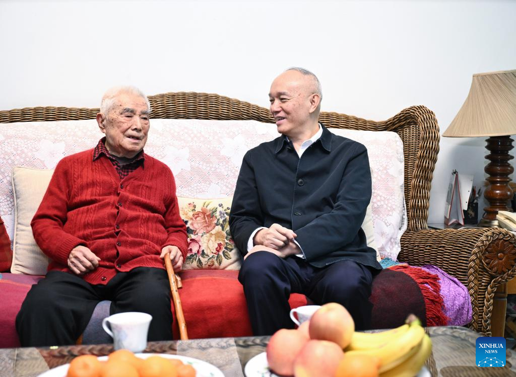 Cai Qi, a member of the Standing Committee of the Political Bureau of the Communist Party of China (CPC) Central Committee and a member of the Secretariat of the CPC Central Committee, visits economist Liu Guoguang on Feb. 7, 2024. On behalf of the CPC Central Committee and General Secretary Xi Jinping, Cai visited several prominent figures on Wednesday morning and extended festive greetings to all people working in the culture, science and technology circles for the upcoming Chinese Lunar New Year. (Xinhua/Yan Yan)