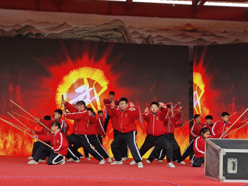 Primary school students perform martial arts during a "village gala" in Dalanzhai village, Dingluan township, Changyuan city, central China's Henan Province. (People's Daily Online/Wang Shaoshao)