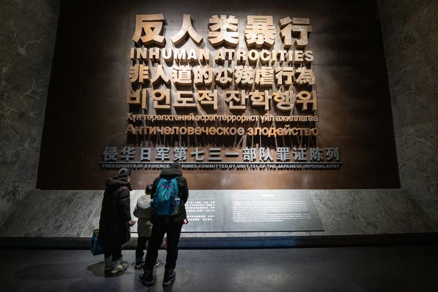 People visit the Exhibition Hall of Evidence of Crimes Committed by Unit 731 of the Japanese Imperial Army in Harbin, northeast China's Heilongjiang Province, Jan. 25, 2024. (Xinhua/Xie Jianfei)