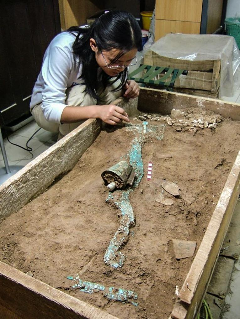 This undated file photo shows an archaeologist working on a turquoise dragon-form artifact at Institute of Archaeology under the Chinese Academy of Social Sciences (IA CASS) in Beijing, capital of China. (IA CASS/Handout via Xinhua)