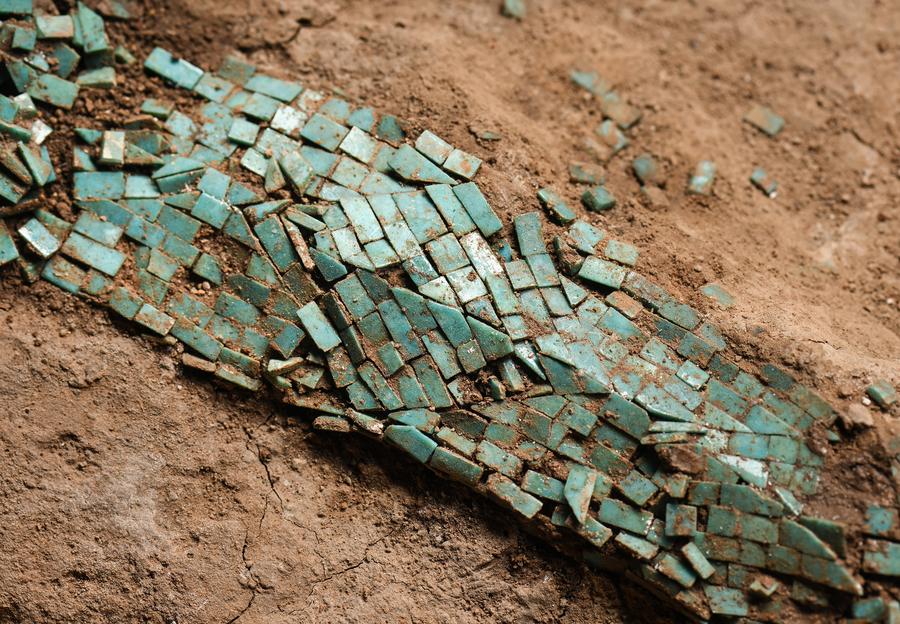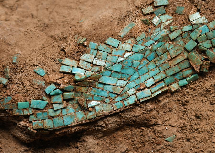 This photo taken on Jan. 29, 2024 shows part of a turquoise dragon-form artifact at Chinese Archaeological Museum in Beijing, capital of China. (Xinhua/Li He)