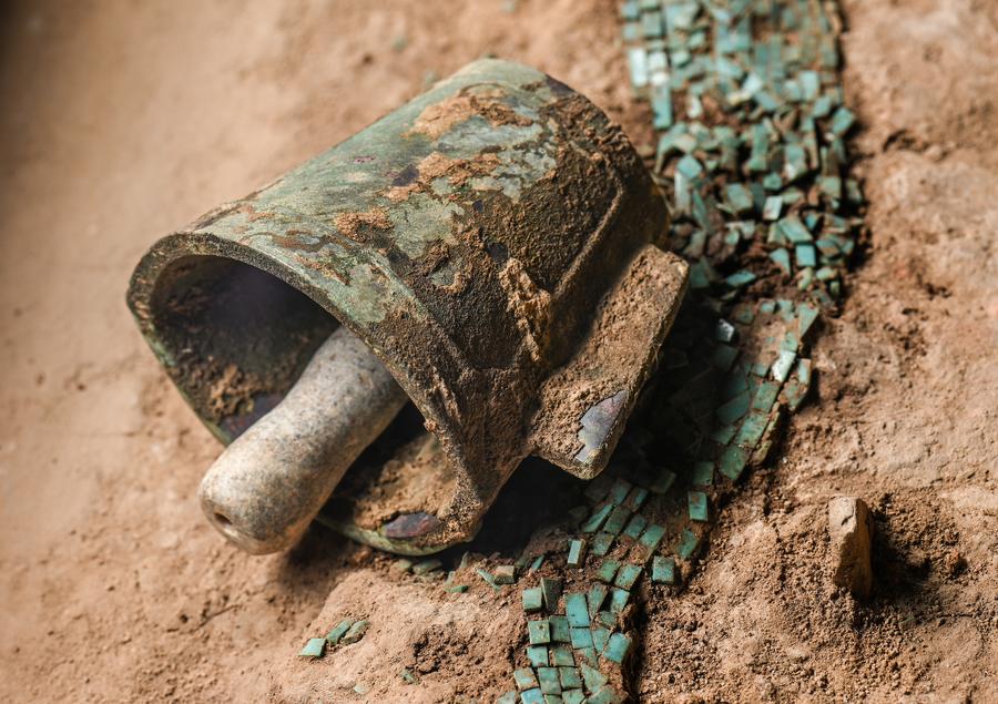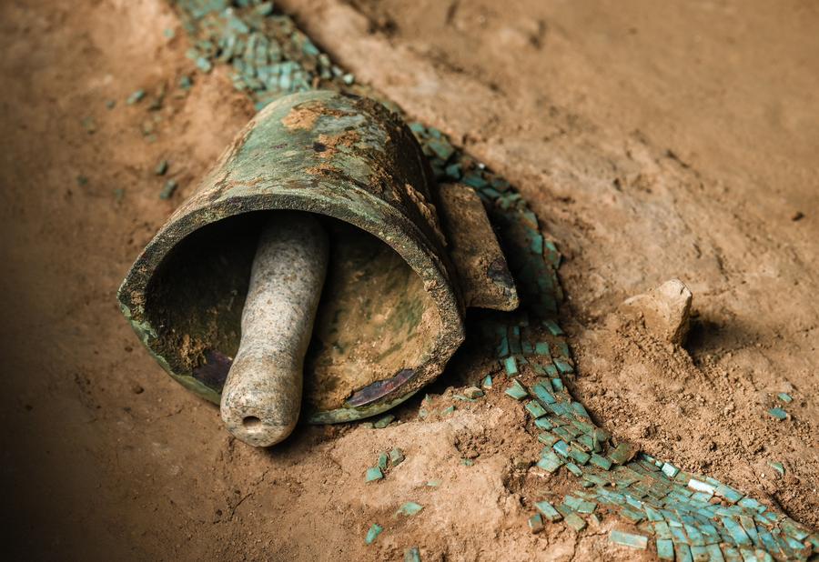 This undated file photo shows the excavation of a turquoise dragon-form artifact at Erlitou site in Luoyang, central China's Henan Province. (IA CASS/Handout via Xinhua)