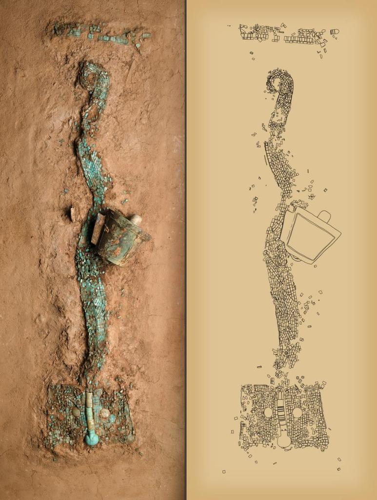 This combo image shows a turquoise dragon-form artifact at Chinese Archaeological Museum in Beijing, capital of China, Jan. 29, 2024 (L, photo taken by Xinhua photographer Li He), and an outline of the artifact drawn by Zhou Qi. (Xinhua)