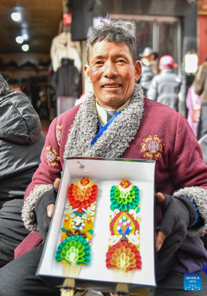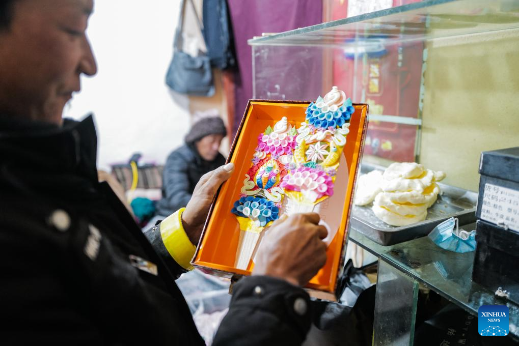 A vendor shows butter sculptures in Lhasa, southwest China's Xizang Autonomous Region, Feb. 7, 2024. The Tibetan New Year coincides with the Lunar New Year, or the Spring Festival, which falls on Feb. 10 this year. As the New Year is approaching, butter sculptures handmade by local craftsmen sell quite well in Xizang. (Xinhua/Sun Ruibo)