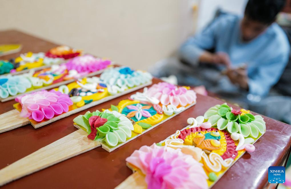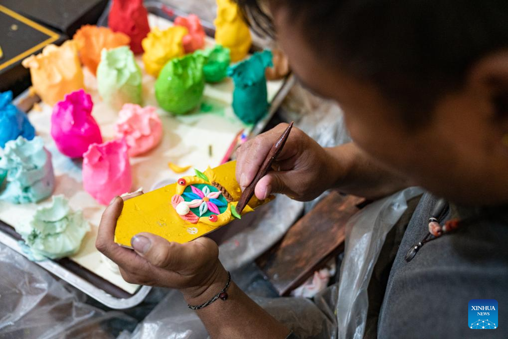 A craftsman makes butter sculptures in Lhasa, southwest China's Xizang Autonomous Region, Feb. 7, 2024. The Tibetan New Year coincides with the Lunar New Year, or the Spring Festival, which falls on Feb. 10 this year. As the New Year is approaching, butter sculptures handmade by local craftsmen sell quite well in Xizang. (Xinhua/Tenzin Nyida)