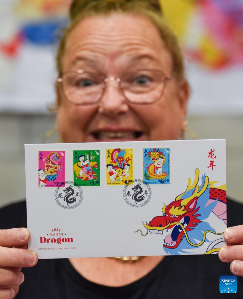 A staff member shows a first-day cover with the 2024 Year of the Dragon stamps published by New Zealand Post in Auckland, New Zealand, Feb. 3, 2024. (Xinhua/Guo Lei)