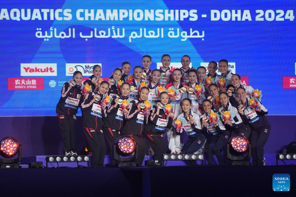 Gold medalist Team China (C), silver medalist Team Japan (L) and bronze medalist Team the United States pose on the podium during the awarding ceremony for team free of artistic swimming at the World Aquatics Championships in Doha, Qatar, Feb. 9, 2024. (Xinhua/Xue Yuge)