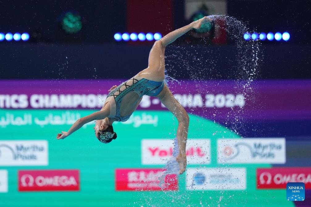 A swimmer of Team China performs during the final of team free of artistic swimming at the World Aquatics Championships in Doha, Qatar, Feb. 9, 2024. (Xinhua/Xue Yuge)