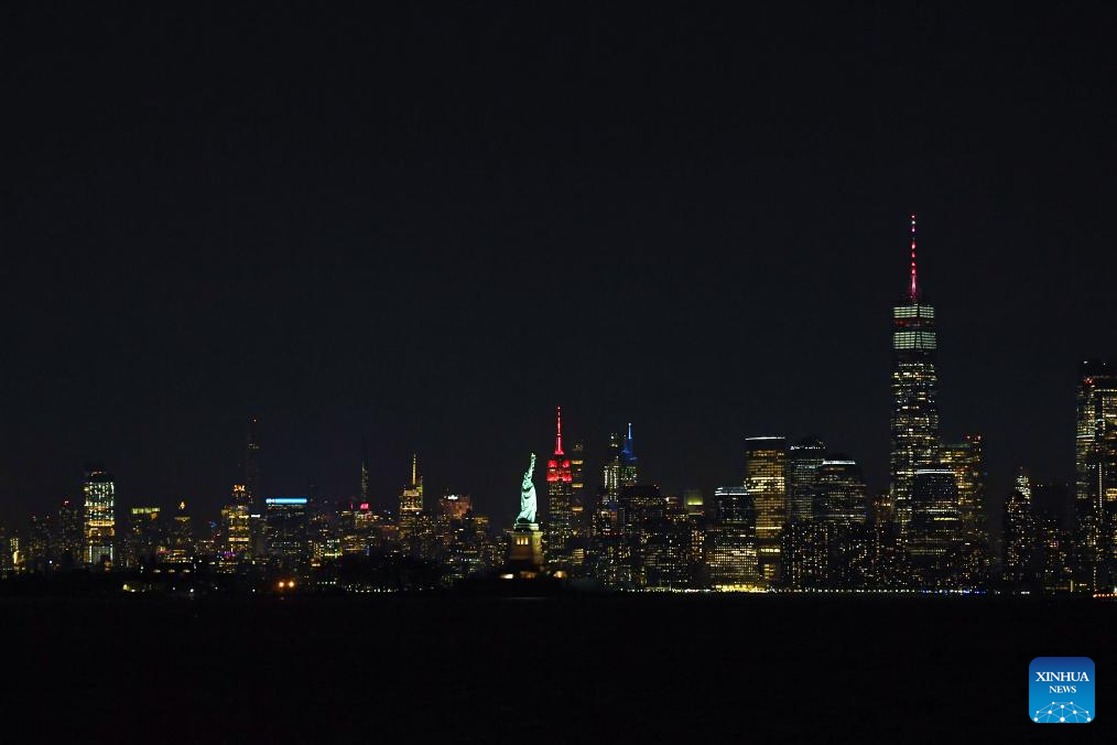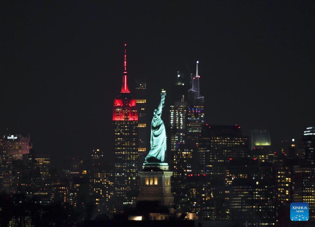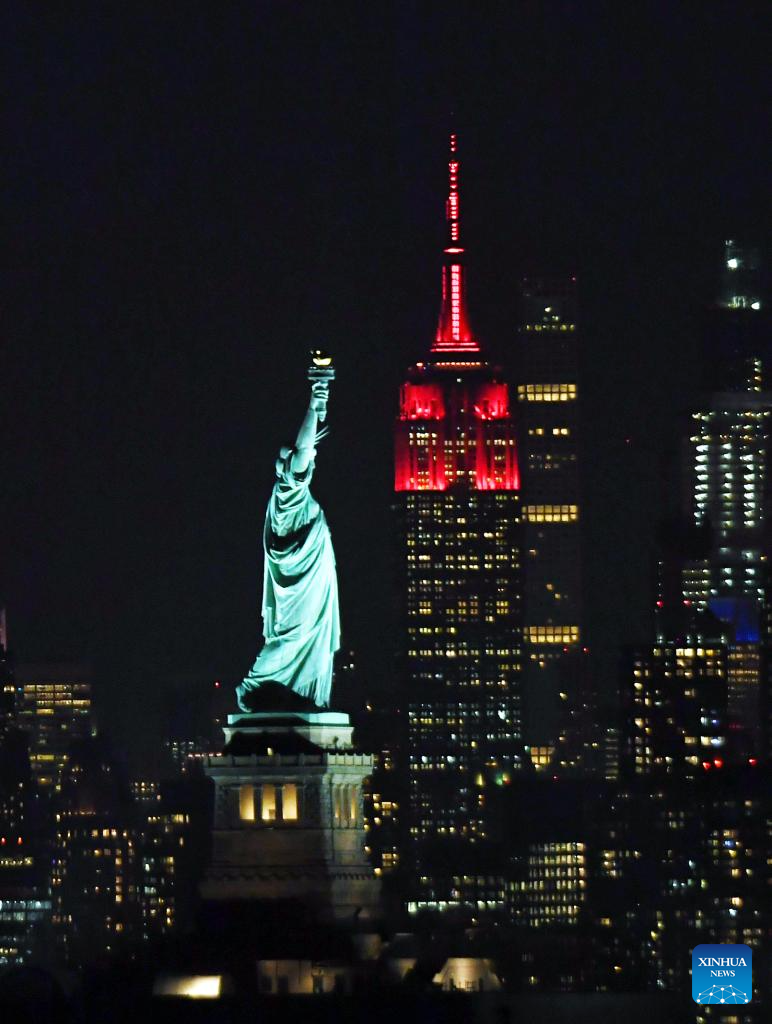 This photo taken on Feb. 8, 2024 shows the Empire State Building lit up in red for the Chinese Lunar New Year in New York, the United States. (Xinhua/Li Rui)