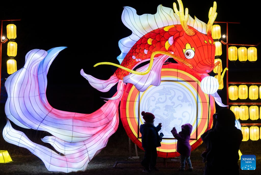 People look at light installations during a lantern show in Markham, Ontario, Canada, on Feb. 8, 2024. This event, featuring over 250 colorful silk lanterns, is held here from Feb. 8 to 25 to celebrate the Chinese Lunar New Year, which falls on Saturday. (Photo by Zou Zheng/Xinhua)
