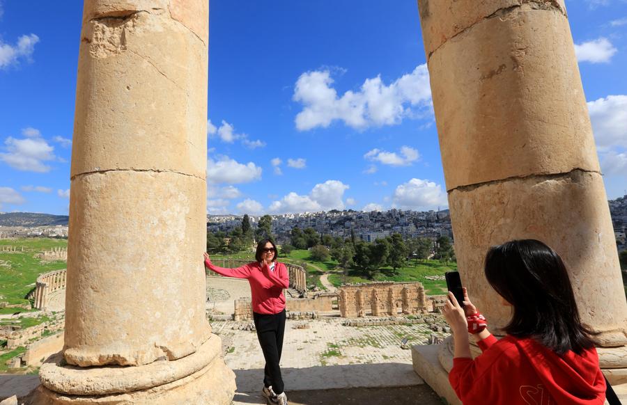 A Chinese tourist poses for photos while visiting the archaeological site of Jerash in Jordan, on Feb. 10, 2024. (Photo by Mohammad Abu Ghosh/Xinhua)